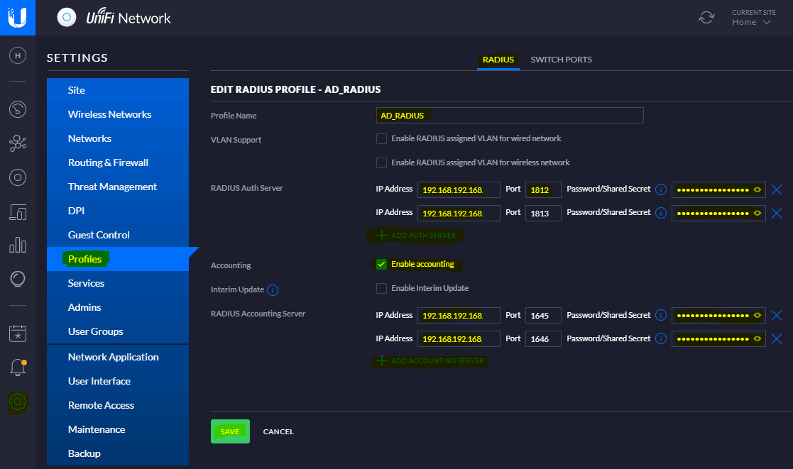 • Adicionar servidor de gerenciamento de contas de usuário RADIUS em: “+ ADD ACCOUNTING SERVER”